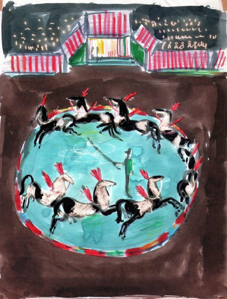 Anatol’s earliest memory was of the circus in the resort town of Yalta in Crimea, when he was around the age of 3 or 4.  He remained forever enamored of the circus, to the point where he even had a special pass to sketch the performers and animals up close at the old Madison Square Garden (he remembered once getting too close to a lion and being chased away by the personnel).  During the 1960s, the Moscow Circus was a special favorite of New York audiences, and I remember going with my parents several times. Among my favorite paintings by my father are ones he did of the Russian circus horses and their daredevil riders.