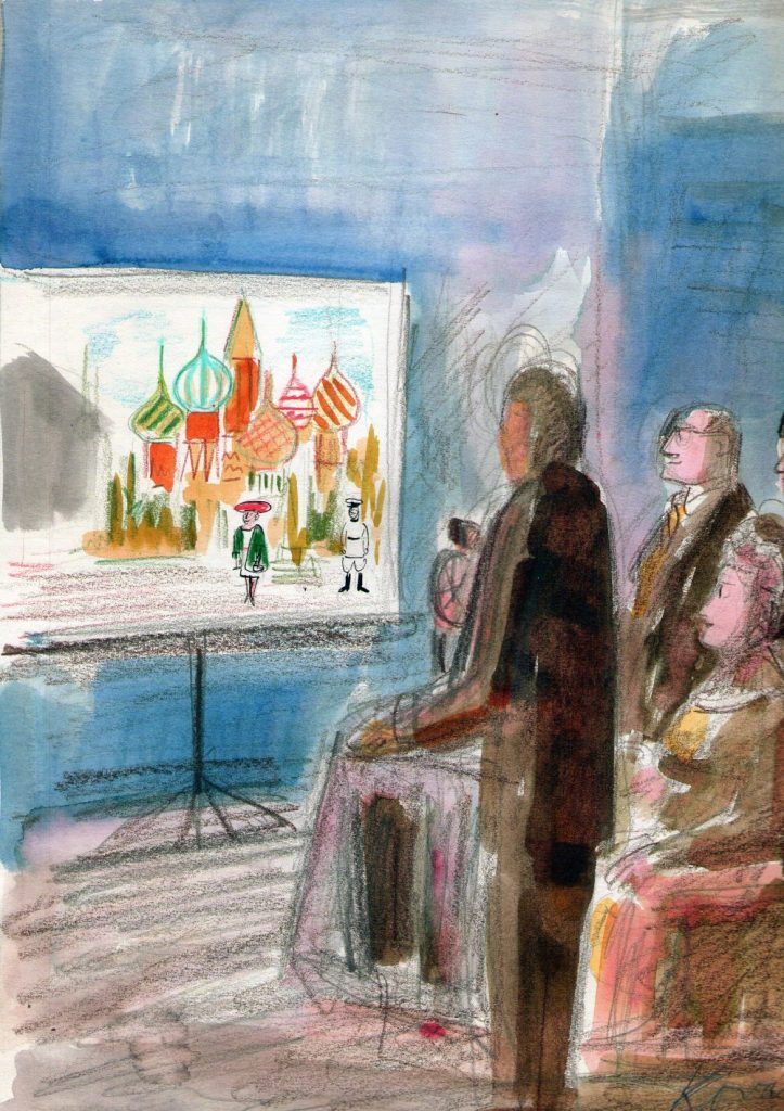 In these cover ideas, my father manages to poke fun simultaneously at both the Soviet and the Western (capitalist) ideological orientations.  The sketches comment ironically on the waning relevance of Communist ideals, by minimizing the presence of Communist emblems: in the first sketch, the star above the modern hotel in the background is rendered not in red, but in grey wash to fade into the background.   But the humor also derives from Anatol’s portrayal of the consumption-oriented perspective of the “bourgeois” visitors with their cameras and, in the second sketch, also of the home movie audience.  There are two focal points in the movie: St. Basil’s with its colorful onion domes, and also the woman in the colorful hat.   By providing the woman with her own bright “dome,” my father creates a visual parallel, cueing us to realize that in the husband’s eyes both objects in the viewfinder are of equal importance.  Or is it the American woman’s presence on Red Square that’s the key element, to mark the spot, as if to state, “we were here” and also perhaps, “look at us!”   (What would Dad have made of the ubiquitous selfie?)