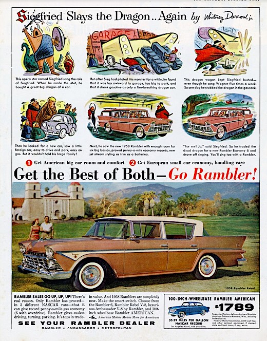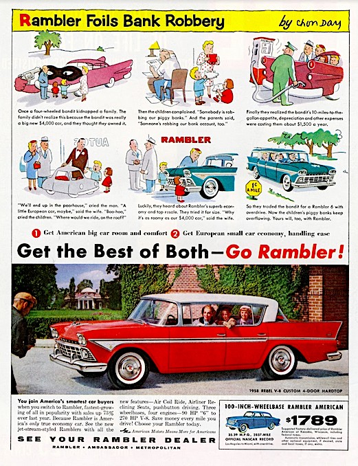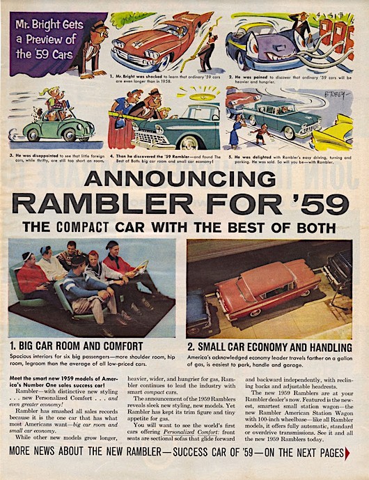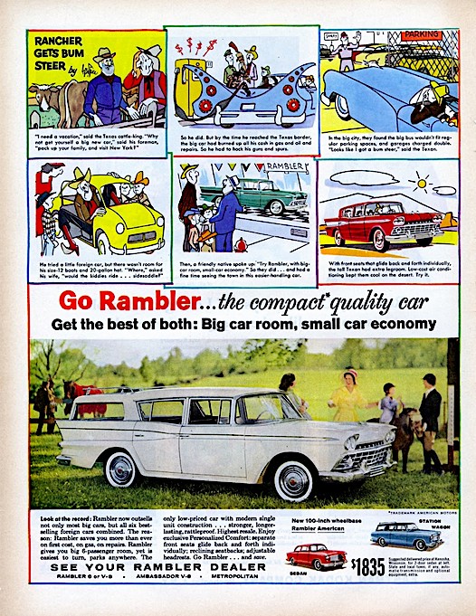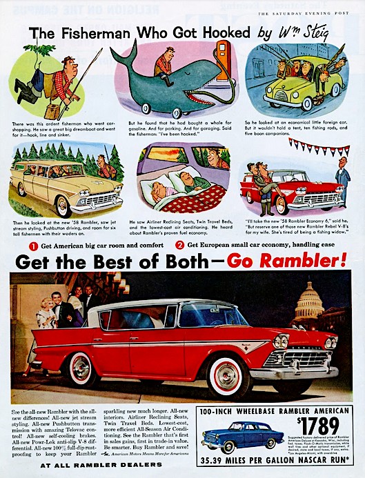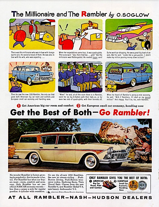 Continuing on with the Spill’s series of advertising work by New Yorker Cartoonists (research and scans courtesy of Warren Bernard of SPX) is this great campaign by Rambler from the late 1950s. Some of the best of the best in the New Yorker’s stable were involved: William Steig, George Price, Whitney Darrow, Jr., Barney Tobey, Chon Day, and Otto Soglow (The Tobey & Price ads are from 1959, the others from 1958).