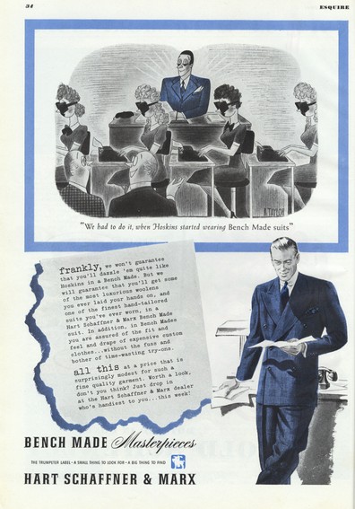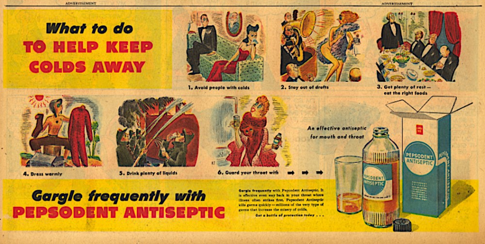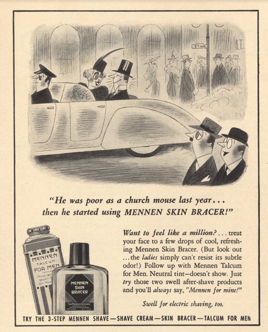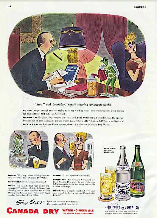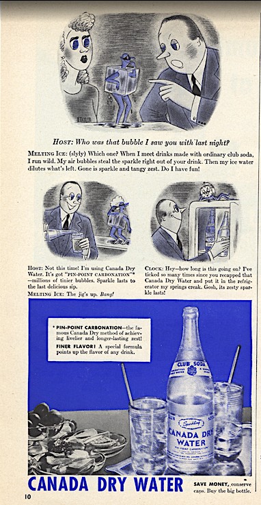 Dates for the ads: Pepsodent Antiseptic, 1944; Canada Dry, 1943; Mennen Skin Bracer, 1940; Hart Schaffner & Marx, 1941; Canada Dry Water, 1943