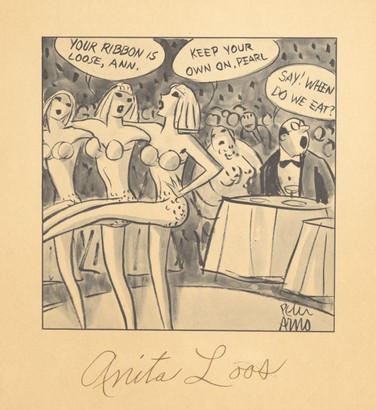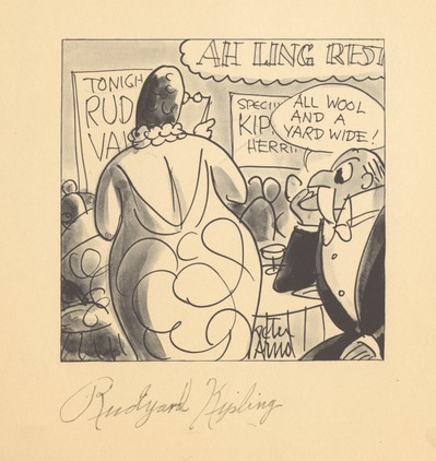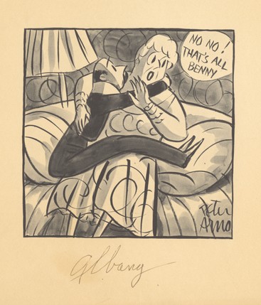 We continue the ad series with Peter Arno’s second solo appearance (his was the first in the series. Arno always needs to be first). My thanks, as usual, to Warren Bernard for all of his work and generosity in sharing these pieces with the Spill folk. What is shown here, according to Mr. Bernard, is promo work for newspapers. As you can see, the drawings contain clues. The reader is supposed to put 2 and 2 together to come up with a proper name. In the first drawing the reader sees “All Benny” and comes up with “Albany”…and so on. Someone has helpfully provided the solution below each drawing. We don’t have dates for these pieces but judging by the style and signature, I’d place the work somewhere in the very early 1930s. If someone can be more precise, please advise.