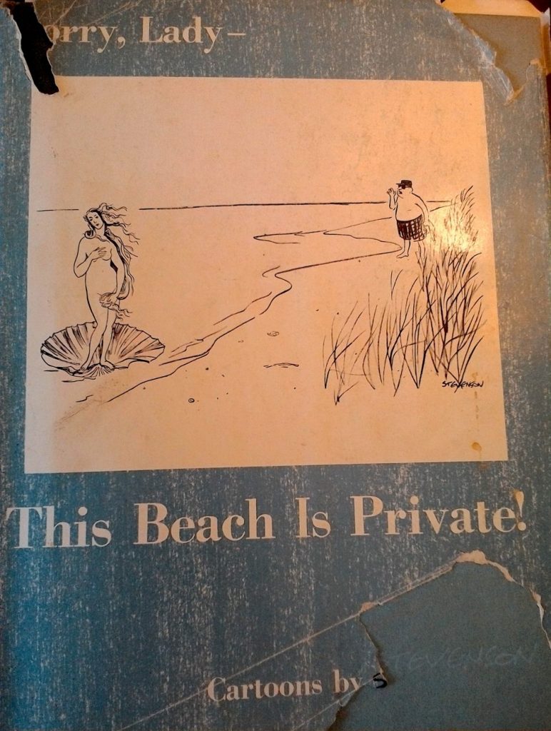 This book is probably the most tattered in the Spill‘s cartoon library, but it is also one of the most treasured. While browsing the humor sections of used bookstores I’ve a habit of looking at every cartoon collection on the shelf (or shelves), no matter the condition, and no matter whether or not I already have a copy at home — you never know what might be inside.  In this case, the surprise was an original signed drawing by James Stevenson.  The collection, Sorry, Lady — This Beach Is Private! was published by Macmillan in 1963.