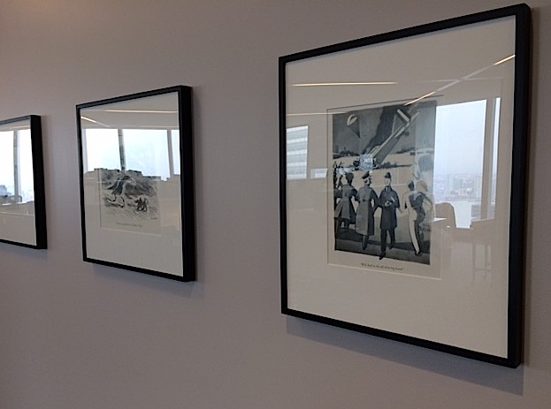 Also exciting: the framed print of one of Peter Arno’s masterpieces, “Well, back to the old drawing board” that was once displayed on the 20th floor at 4 Times Square also traveled downtown to the 38th floor of 1 World Trade Center. (photo above courtesy of Liza Donnelly)