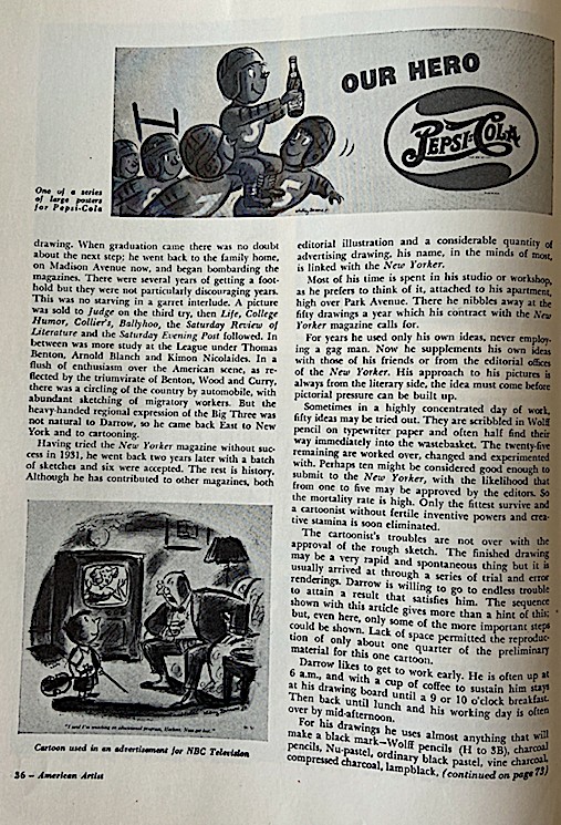Warren Bernard, frequent Spill supplier of New Yorker archival materials, has unearthed this fab February 1950 American Artist article on the late great New Yorker artist Whitney Darrow, Jr.. My thanks to Mr. Bernard for sharing it with us. As a bonus, there’s an ad featuring Mr. Darrow, Jr.’s favorite drawing paper.