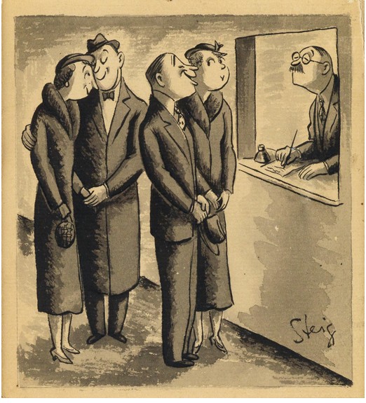 Cartoons on the block by Steinberg, Mischa Richter, Barbara Shermund, William Steig, Richard Taylor, Edward Sorel, Victoria Roberts, Charles Addams, Helen Hokinson, Rea Irvin, and Peter Arno.