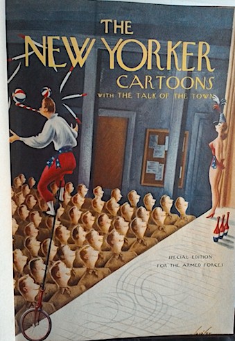 Judging by the list of available titles provided at the end of each edition there were close to a thousand titles issued during the war (a wide variety, from Mark Twain to Thackeray). I don’t have a complete list so I’m in the dark about which New Yorker-related titles were issued other the one shown here, The Thurber Carnival, The New Yorker’s Baedeker, The New Yorker Profiles, and Thurber’s Let Your Mind Alone. (If anyone knows of more please let me know). These special publications were very small: 3 3/4″ x 5 1/2″ — small enough to fit in a soldier’s pocket. There was a Bill Maudlin Armed Services title published (it’s #822, Up Front). Technically, he was a New Yorker cartoonist with one drawing published, April 1, 1950. But that appeared five years after Up Front was published in 1945. Splitting hairs, I know.