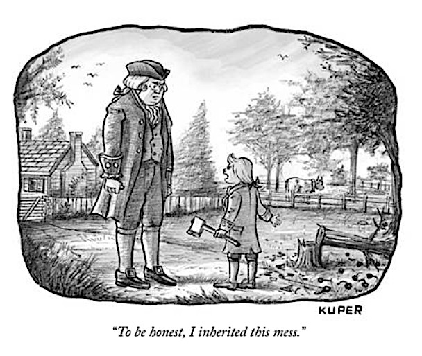 MM: The current political climate must seem like a shooting-fish-in-barrel moment for you — evidenced by your work frequently showing up on the New Yorker’s online Daily Cartoon. One of those drawings [shown above] received a good deal of notice . Can you describe how this drawing came to you?