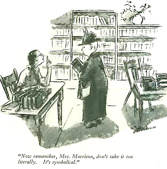 One of the Boston newspapers informed me that The New Yorker artists did not always think up their own ideas for pictures, that the management paid outsiders for suggestions. I sent in an account of a situation I thought would make a good Helen Hokinson picture — a lady librarian handing over a book to a patron with the admonishment, “Now don’t take this too literally, it’s symbolism” — and got paid for that: seven dollars.