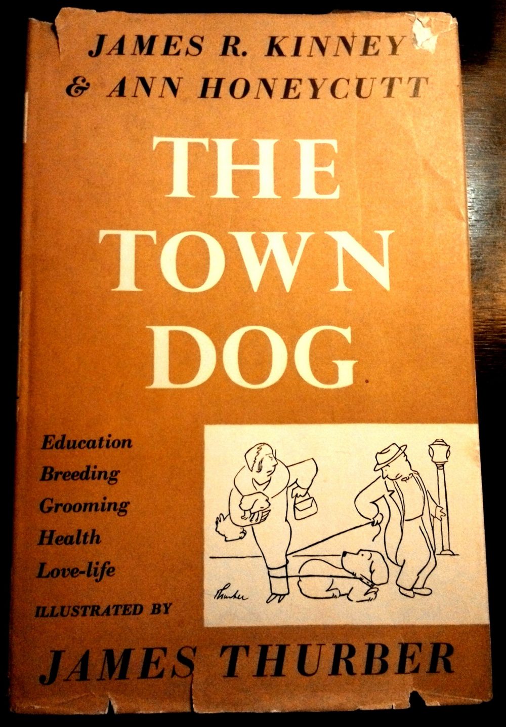 The other day while browsing around my favorite used bookstore, Rodgers Book Barn, with two New Yorker pals (John Cuneo and Danny Shanahan) the above book caught my eye because of the Thurber drawing. My eyes widened when I realized I had never seen this particular book before (or had I?). It turned out to be a British revised edition of How To Raise A Dog In the City and In The Suburbs, published by Simon & Schuster in 1938. This new found edition, retitled, The Town Dog: Education Breeding, Grooming, Health, Love-Life, was published by Harvill Press in 1954. Below is the US second printing of How To Raise A Dog…(this dust jacket was screen-grabbed, as my copy lacks one). Thurberites will recognize one of the co-authors, Ann Honeycutt, for whom Thurber famously carried a torch. See either Burton Bernstein’s bio Thurber, or Harrison Kinney’s Thurber: His Life and Times for a whole lot more on that subject.