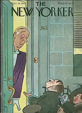 Ross’s mentioning “no more specific people on covers” meant that there had to have been previous New Yorker covers with specific people, or at least one cover with a specific person. Curious, I took The Complete Book of Covers from The New Yorker off the shelf and began looking at the magazine’s covers, beginning with the very first New Yorker cover –- you know the one: Irvin’s very own top-hatted dandy commonly referred to as Eustace Tilley. Paging through the book I didn’t find a “specific person” cover until I arrived at the issue of November 22, 1941. A child at the door of a wealthy home is sporting a Hitler mask. The artist: Rea Irvin.