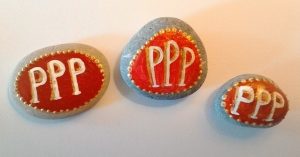 Remarks and remembrances were followed by a show of photographs, and following that,  small hand painted stones as you see pictured here, were handed out.  (Mr. Porges was know to many as “PPP” — pronounced, “pay pay pay”).