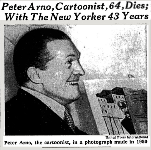 I’m not one for remembering death dates, but this is one to note: One of the New Yorker‘s cartoon gods, Peter Arno, died 50 years ago today. Here’s the headline on the front page of The New York Times, February 23, 1968.