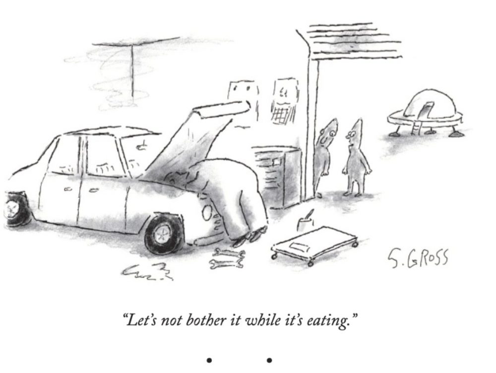Mr. Gross and I had the identical thought of burying a mechanic’s head deep into the engine well (though he obviously had it first). But here’s the big big big difference: he came up with a brilliant idea for the drawing while I was staring into space awaiting help from the cartoon gods. Mr. Gross’s aliens, and his fabulous caption made for a terrific drawing. All I had was a mechanic with his head deep down under the hood of a car. Mine’s not really even a full-fledged cartoon, but a potential cartoon (it’s now officially a potential cartoon with no potential).