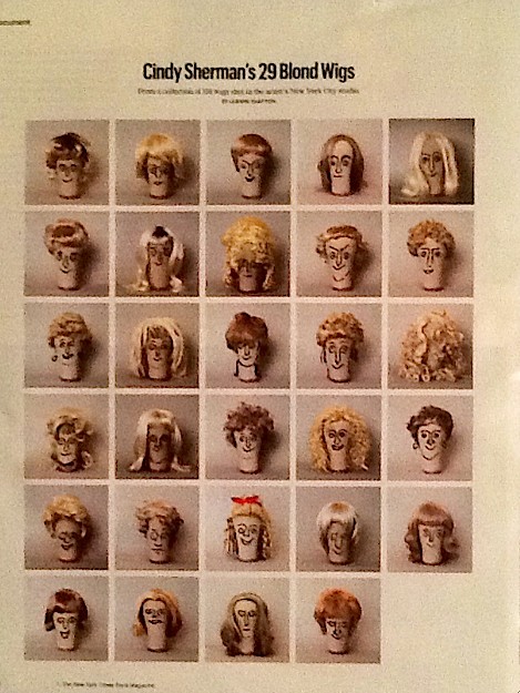 Ink Spill received the above piece from him yesterday. When he saw “Cindy Sherman’s 29 Blond Wigs” in The New York Times T Magazine on August 24th, “It seemed,” his daughter wrote me in an email, “to be asking for Kovarsky to doodle on it.”