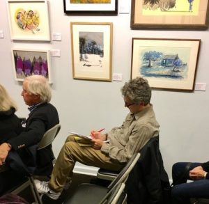 As visitors to this site know, there’s an exhibit of work by George Booth at The Society of Illustrators. The show is a real treat. Last night Mr. Booth was on stage in front of a packed house, telling stories and answering questions. Here are some photos, courtesy of Liza Donnelly.