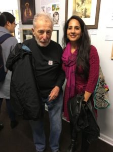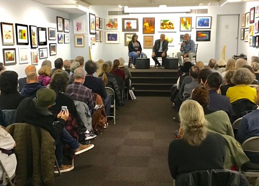 Below: the scene at The Society. On stage: Sarah Booth, George Booth, and J.J. Sedelmaier, who curated the exhibit.