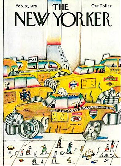 Noted along the way from Ms. Kurzweil’s drawing to Mr. Kaplan’s: Rui Ruireiro’s spot drawings making good use of yellow. I see the predominant use of yellow in the New Yorker (especially if it involves a yellow cab, such as on page 28) and I’m immediately reminded of Steinberg’s masterful use of it on a cover back in 1979: