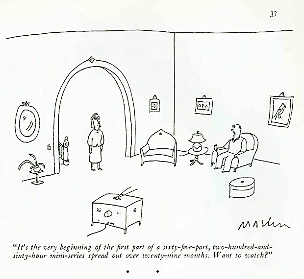 Sixteen pages later is a David Sipress television documentary series cartoon. Seeing this I couldn’t help but recall one done in the same school of thought published in the New Yorker 35 years ago by a then relative newcomer to the magazine (me). Coincidentally, Mr. Sipress and I share an affection for the word and number “six” in our captions: he uses it once, “…ninety-six part -documentary…” and, as you see below, I used it twice (coincidentally, and unimportantly, I was in my sixth year of contributing when the drawing below appeared in the issue of May 2, 1983).