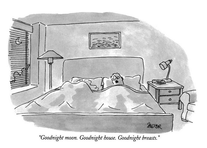 Six pages later a Zach Kanin cozy-under-a-blanket-by-a-fire drawing (coincidentally, the action in the drawing is set on a sofa). The cartoon is anchored by the use of the word “breasts” in the caption. A quick online search shows a modest number of New Yorker breast-related cartoons, with very few actually mentioning breasts in the caption. One that came readily to mind is this classic courtesy of Jack Ziegler from November of 1997.