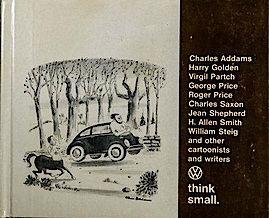 Herbert Valen Besides his efforts as an idea writer (for Peter Arno, among others), we cartooniacs should be forever grateful to Mr. Valen for editing Think Small, a collection of cartoons and humourous writing published by Volkswagon in 1967. The writing and drawings are dedicated to the iconic VW Beetle. Mr. Valen included a good number of The New Yorker’s top artists, including Charles Addams, Anatol Kovarsky, George Price, and William Steig– and just as wonderful: there are photographs of each artist. Mr. Valen’s photo from the book appears above, as does the book’s cover (drawing by Mr. Addams).