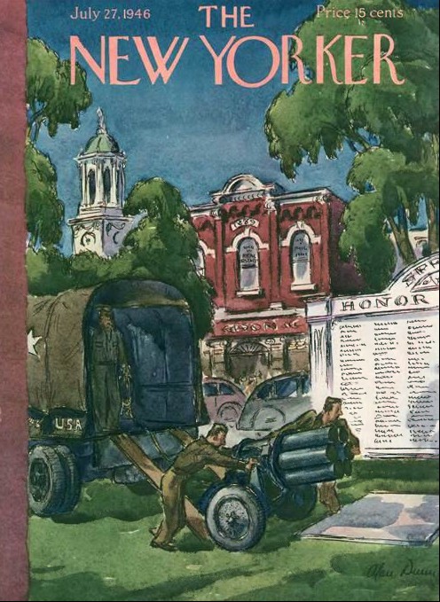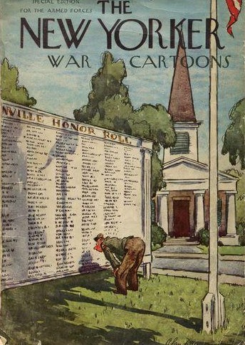 Alan Dunn, among the most prolific of all New Yorker cartoonists, contributed nine covers to the magazine, six of them related to war (WWII to be precise). I am reminded every Memorial Day weekend of his cover of August 11, 1945 which was chosen for the paperback publication, The New Yorker War Cartoons (not to be confused with The New Yorker War Album). Mr. Dunn used the Honor Roll again almost exactly one year later for the issue of July 27, 1946.
