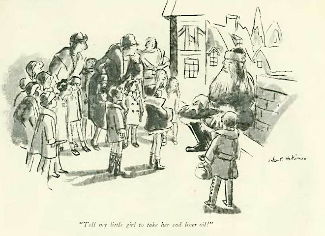 As usual with Ms. Hokinson, the drawing looks as if she dashed it off with brilliant ease. I love the little glimpse of a village. Was it a flat backdrop, or an actual small constructed set. Santa, sitting in front of what seems to be a chimney top, or low wall, looks weary in his debut.